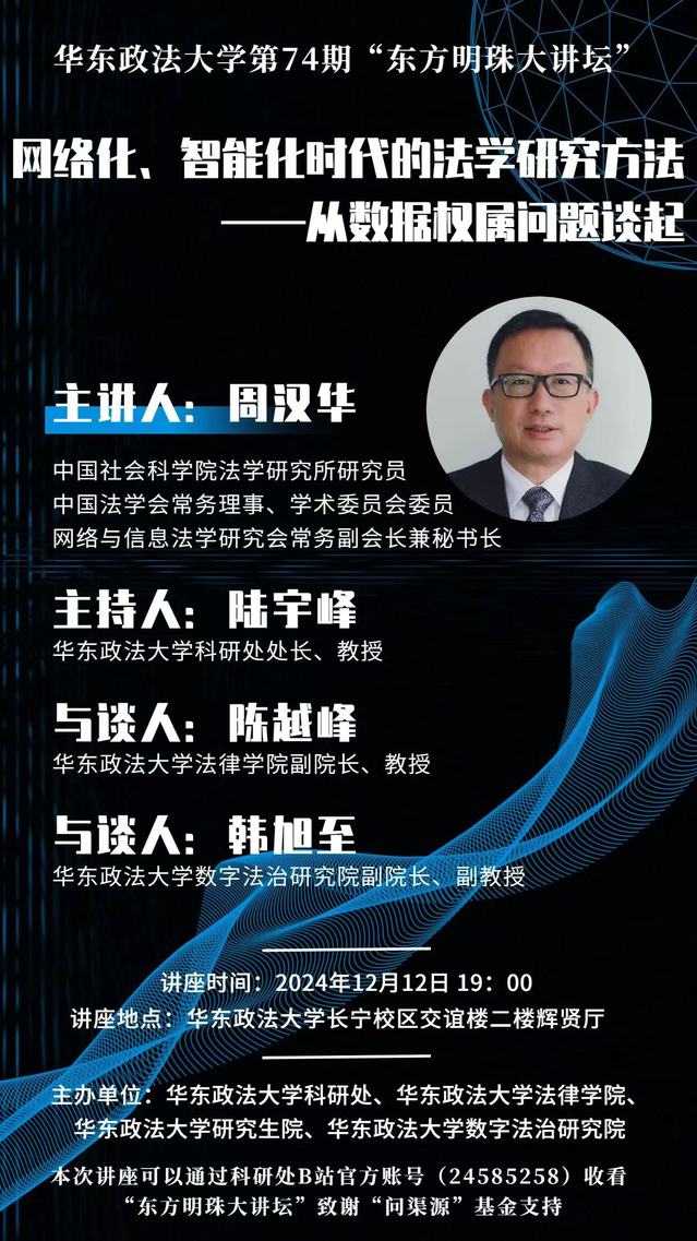 有鉴于此,KY开元集团官网第73期“东方明珠大讲坛”有幸邀请到中国社会科学院法学研究所研究员、中国法学会常务理事、学术委员会委员、网络与信息法学研究会常务副会长兼秘书长周汉华教授主讲“网络化、智能化时代的法学研究方法——从数据权属问题谈起”。
