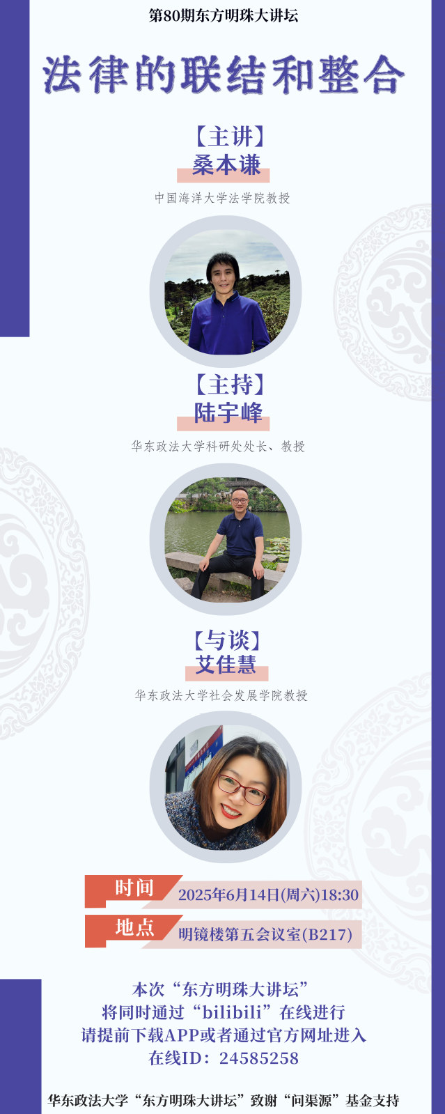 桑本谦教授为中国海洋大学法学院教授,学术作品涉及法理学、法律史、刑法、民商法、行政法、经济法、诉讼法等多个领域。著有《法律简史:人类制度文明的深层逻辑》《理论法学的迷雾:以轰动案例为素材》《私人之间的监控与惩罚》等。 讲座将结合最新的法律法规和生动的案例,为大家开启新的认知视角,深化对法律深层逻辑和实践应用的理解,以“联结与整合”的思维范式为法学研究与实践提供新的思考方向。
